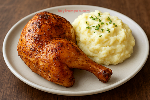 Accompanying the roasted chicken is a side of smooth, creamy mashed potatoes that pair perfectly with the tender chicken. Made from fresh, high-quality potatoes and blended with butter and a touch of cream, this side dish offers a harmonious balance of flavor and texture. With every bite, you’ll experience the heartwarming satisfaction that only good comfort food can provide. The mashed potatoes are lightly seasoned, allowing the natural richness to shine, all while complementing the savoriness of the roasted chicken.